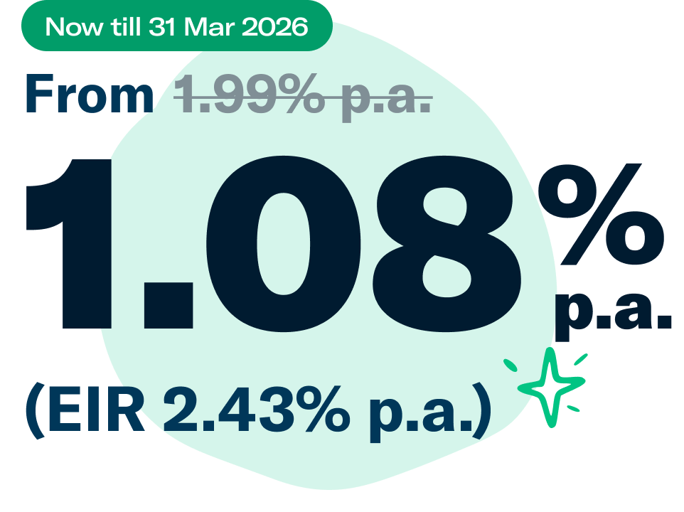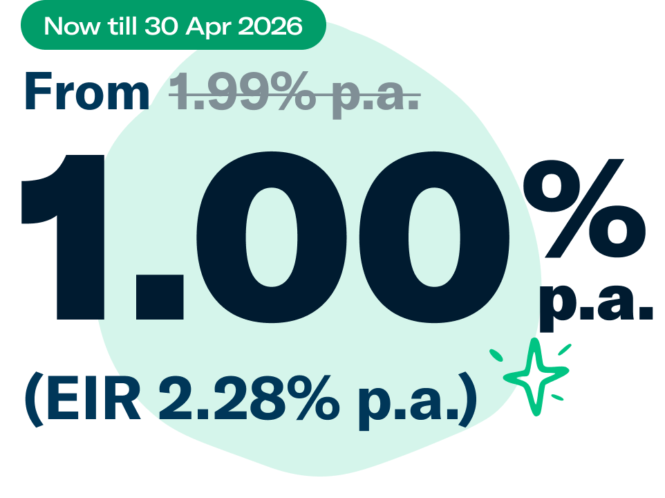 * Effective Interest Rate (EIR) is calculated based on a loan amount of S$20,000 and loan tenure of 60 months from 1 Jan 2026. Maximum EIR may be up to 25.03% p.a. based on your personal credit profile.